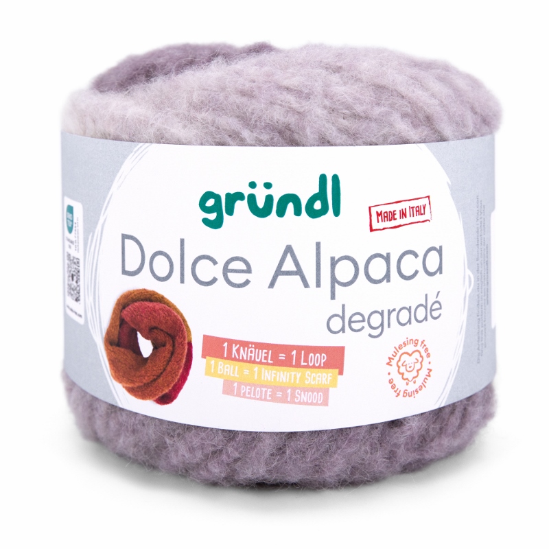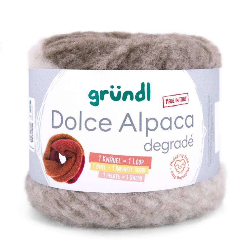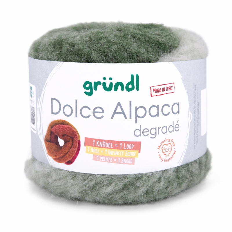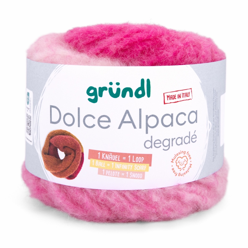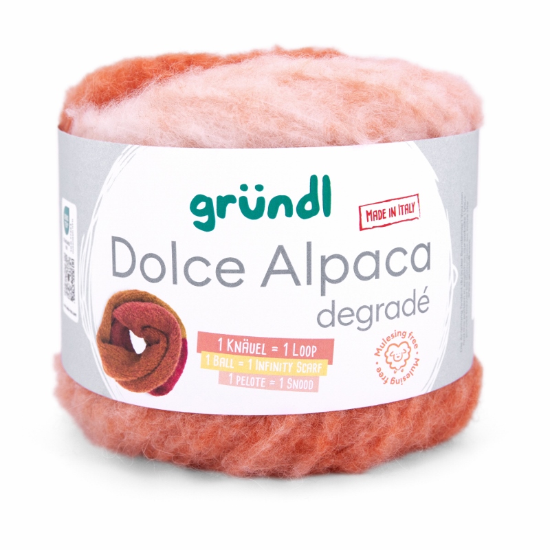 Gründl Dolce Alpaca Degradé – Alpaka-Merino-Mix mit traumhaftem Farbverlauf, so weich, dass du nie wieder etwas anderes willst. Dolce Alpaca Dégradé ist pure Kuschelmagie – ein Garn, das du spürst, bevor du es verstrickt hast. Der luxuriöse Alpaka-Merino-Mix mit 48% superfeinem Alpaka, 44% weicher Merinowolle und 8% Polyamid vereint alles, was dein Strickherz höherschlagen lässt: unglaubliche Weichheit, federleichtes Volumen und edlen Glanz. Dieses Garn hält warm, kratzt nicht und schmiegt sich so angenehm an, dass du es nie wieder aus der Hand legen möchtest.