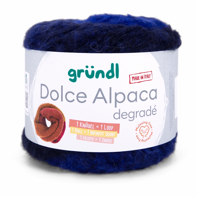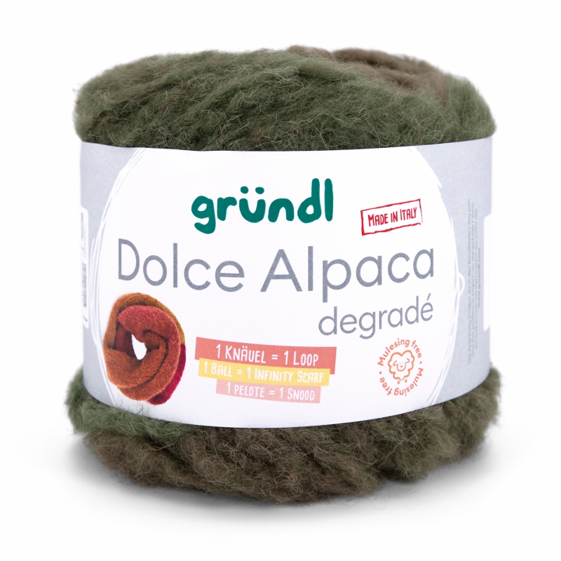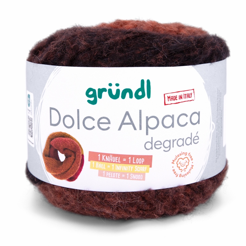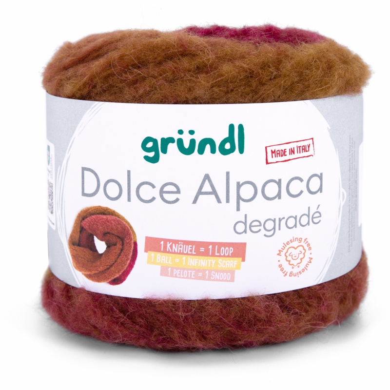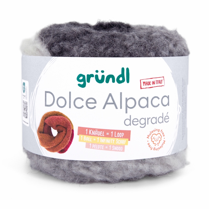 Gründl Dolce Alpaca Degradé – Alpaka-Merino-Mix mit traumhaftem Farbverlauf, so weich, dass du nie wieder etwas anderes willst. Dolce Alpaca Dégradé ist pure Kuschelmagie – ein Garn, das du spürst, bevor du es verstrickt hast. Der luxuriöse Alpaka-Merino-Mix mit 48% superfeinem Alpaka, 44% weicher Merinowolle und 8% Polyamid vereint alles, was dein Strickherz höherschlagen lässt: unglaubliche Weichheit, federleichtes Volumen und edlen Glanz. Dieses Garn hält warm, kratzt nicht und schmiegt sich so angenehm an, dass du es nie wieder aus der Hand legen möchtest.